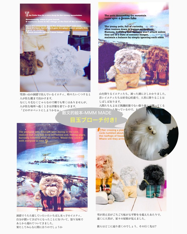 イエティ 2026 コーデュロイ サロペット付 お守り袋+縫いぐるみ=まもぐるみ 組成 表地)ポリエステル、アクリル、羊毛フェルト 持ち手/牛革 裏地)ナイロン 本体サイズ 単位:cm 約16×18(手足を除く) 入り口、カーブで20 配送方法) レターパックプラス イエティしろ202601 イエティグレー202602 \作者よりメッセージ/ ぼくはデジタル一眼のケースとして使っております。 スマホポシェットにしても最適かと。 部屋に飾っているという人も聞きましたし、お出かけの際はカバンに入れて、持ち歩いてもいいかなと。 そういや、電車でこどもをあやす道具にしてる人も居たな。 身につけて使う中で知らない誰かと話すきっかけになるならそれも素敵ですね。 _________________________________________ "Mamogurumi" is your imaginary friend, I hope will protect you . All design and sewing by MMM MADE Tsujioka. _________________________________________ chap.1 雪深い山の洞窟で住んでいるイエティ、時々たいくつすると人が住む麓まで出かけます。 なにしろ毛むくじゃらなので裸でも寒くはありませんが、人が住む場所へ赴くときは洋服を着ていきます、「どのサロペットにしようかなぁ」 chap.2 山を降りるイエティたち、凍った湖にさしかかりました。 若いイエティたちは好奇心旺盛で、人里に降りることはしばしばあります。 人間たちもよほど飢餓状態でない限り彼らが襲ってくることは無いと知っているので、お互い気にしないことで均衡を保っています。 chap.3 洞窟でうたた寝していたいたいちばん末っ子のイエティ、自分が置いてきぼりになったことに気づいて、怒り気味であとから遅れてついてきました。 果たしてみんなに間に合うのでしょうか chap.4 雪が消え岩がごろごろ転がる平野をを超えたあたりで、遠くに人里が、家々の屋根が見えました。 彼らはどこに辿り着くのでしょう、その行く先は?