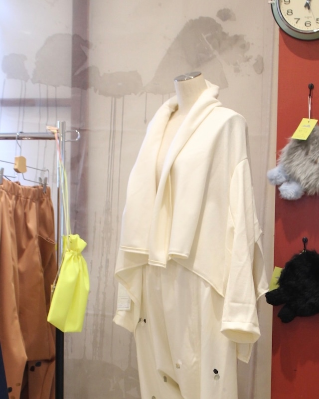 MMM MADEの秋冬衣料品、上下逆さ両方向着用可能なカーディガントップス 平置きするとぺたんこの長四角 男女兼用デザインです 肉厚の弱圧縮天竺ニットを使用しました 落ち感ととろみのあるウールニットです 【フリーサイズ】身長150—170cm対象 カラー オフホワイト 組成 ウール100% 縫い糸(メローロック)ナイロン100% 中性洗剤にて手洗い可
