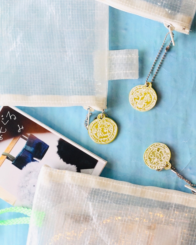 MMM MADE辻岡直筆プラバン、メダイコインチャーム付のビニールパース 小物入れ、小銭入れ、ペンケースとしても使えます サイズ 11×14cm メダイコイン:ポリスチレン 本体:PP 蛍光黄緑のヒモは蓄光で暗がりで光ります まもぐるみミニ絵本ZINE付き