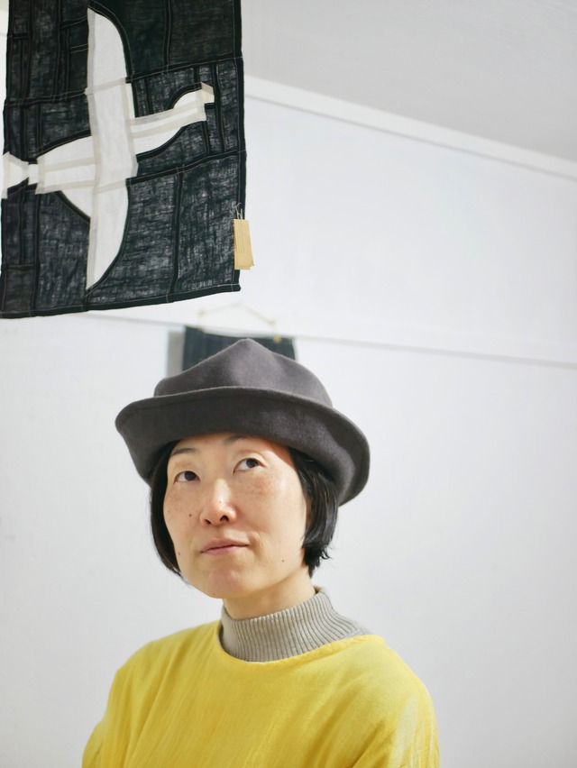 おやすみ展より、応接室の仕切り コットンボジャギ のれん型 サイズ 138x80cm 組成 綿100% 厚さ シャツ生地くらい、部分によって透け感が違います 折り伏せ縫いから飛躍し、向こうの空間がそのまま見えるよう、空いている小窓を縫いました。 上部はループになっており、のれんの使い方で棒が通せるようになっています。 [HOW TO WASH] 手洗い。または弱洗濯機。 縫製後ワンウォッシュしています