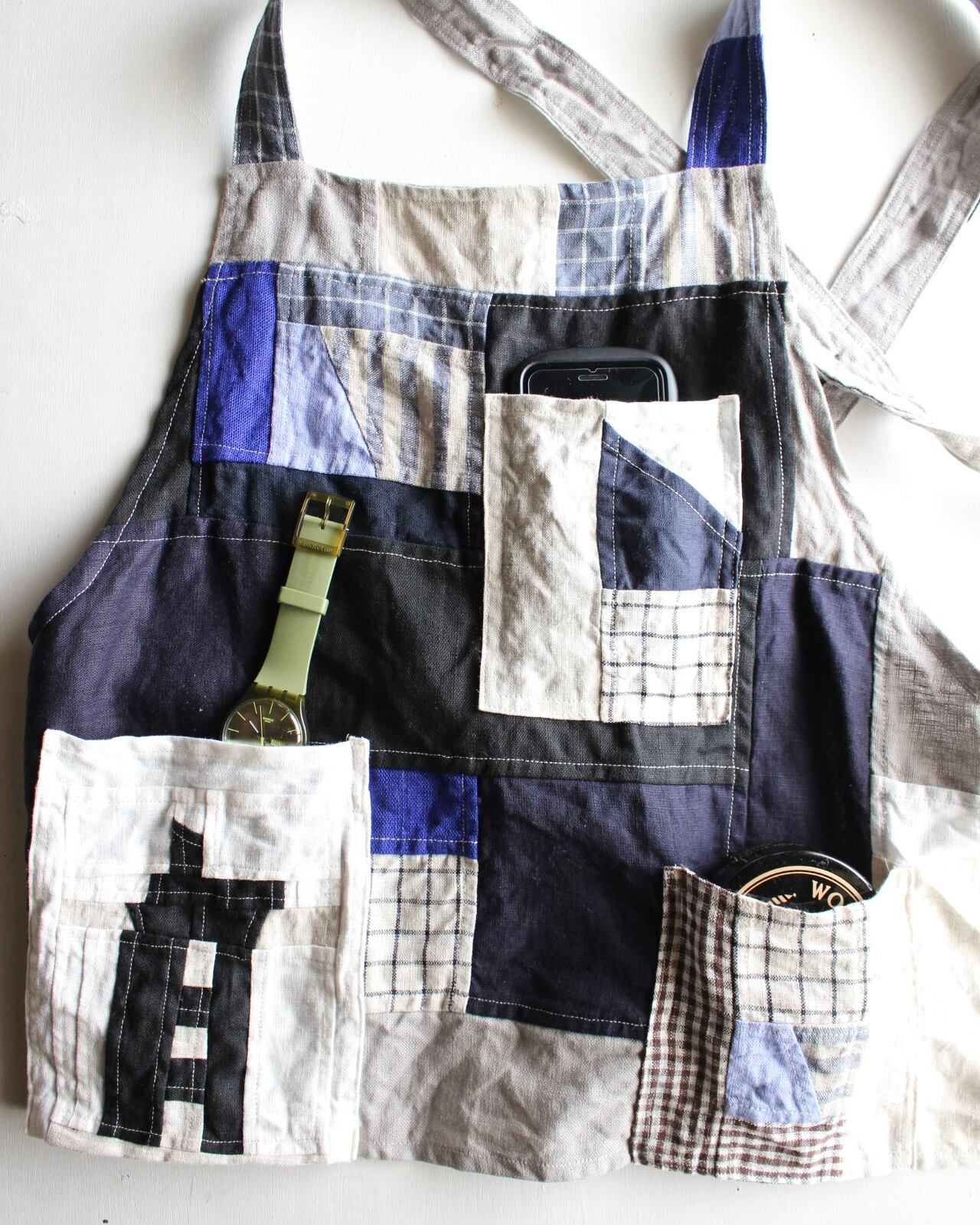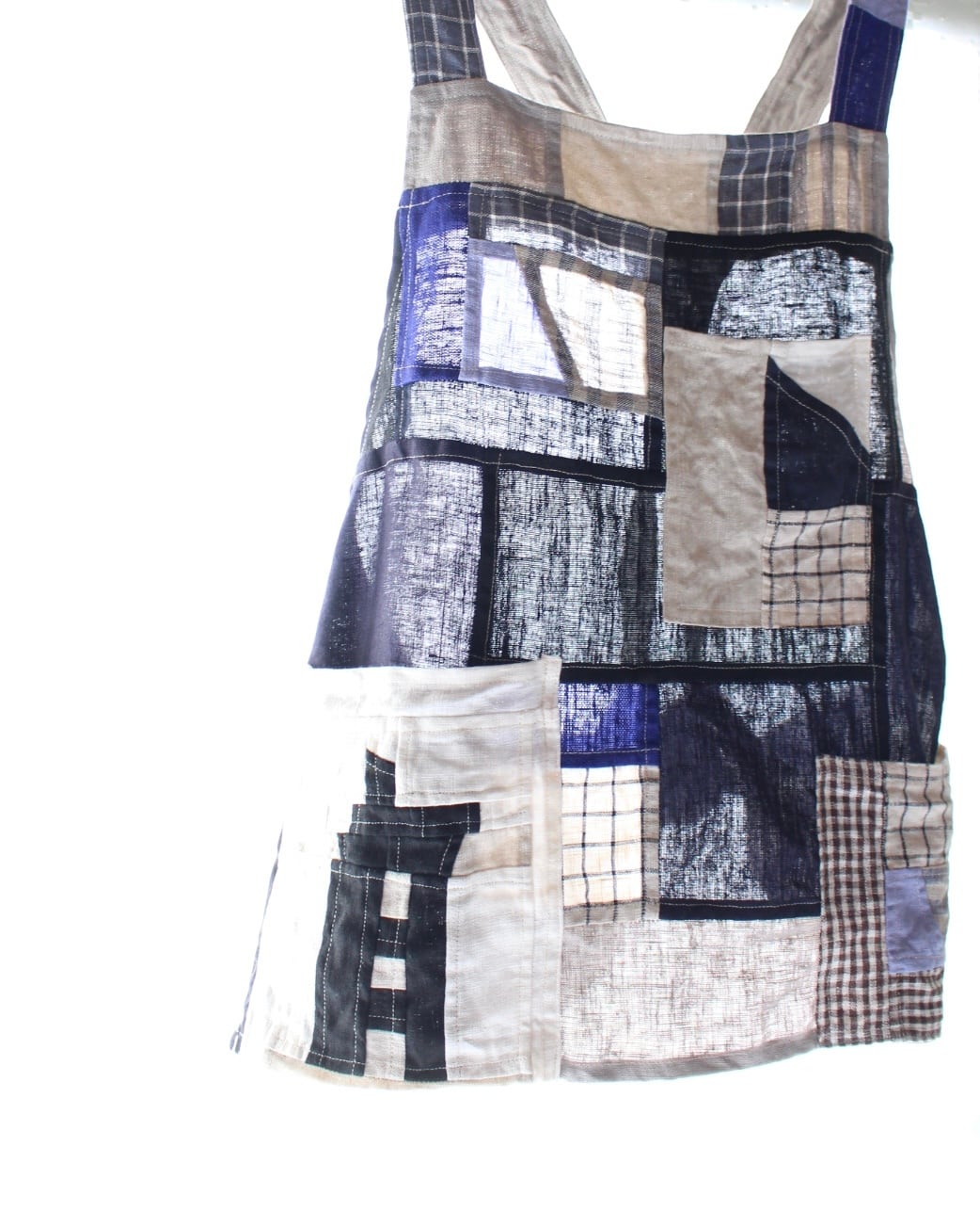 厚手〜中厚のリネンを折り伏せ縫いでパッチワークにして製作したショート丈の被りタイプエプロン。