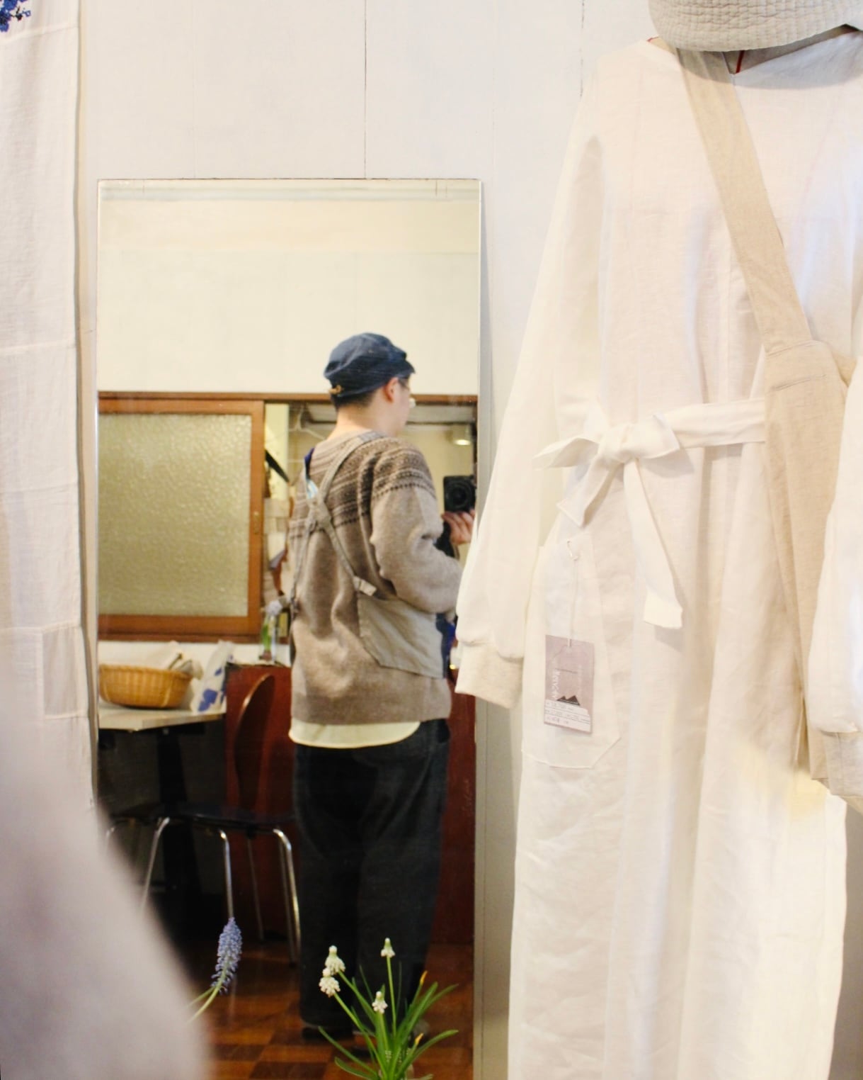 腰回りに紐のない、締め付けゼロ、被るタイプのリネン素材のプットエプロン。
