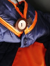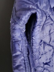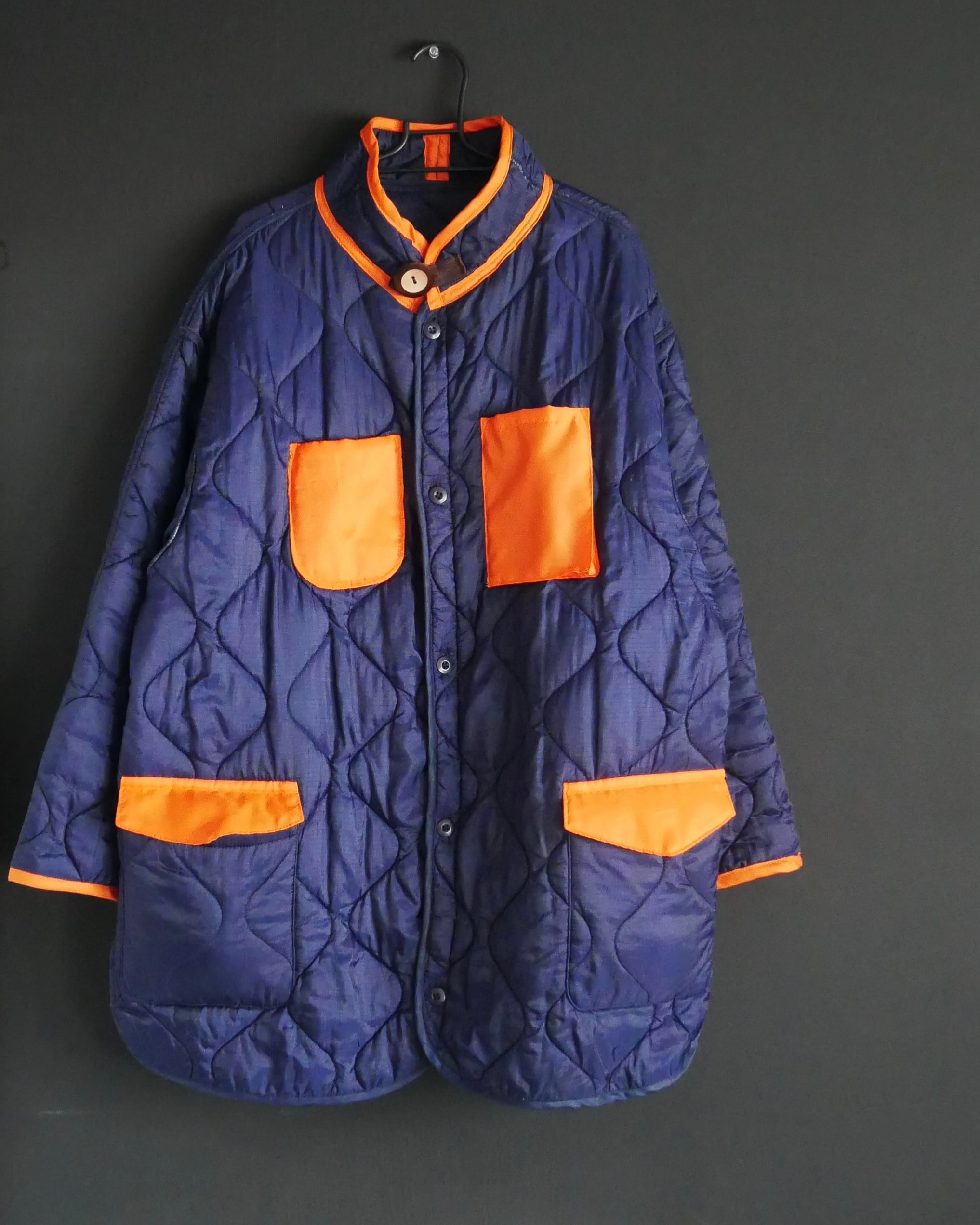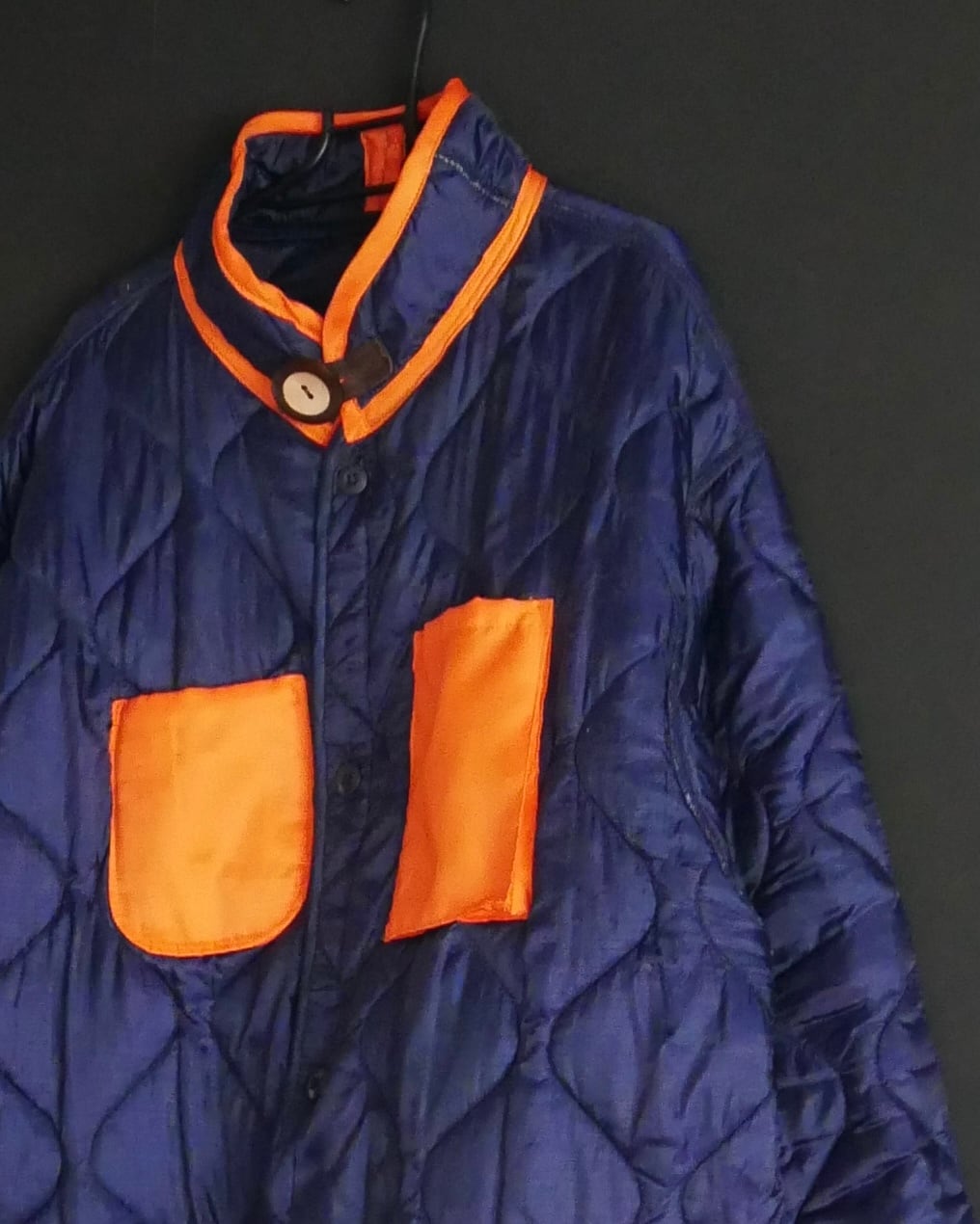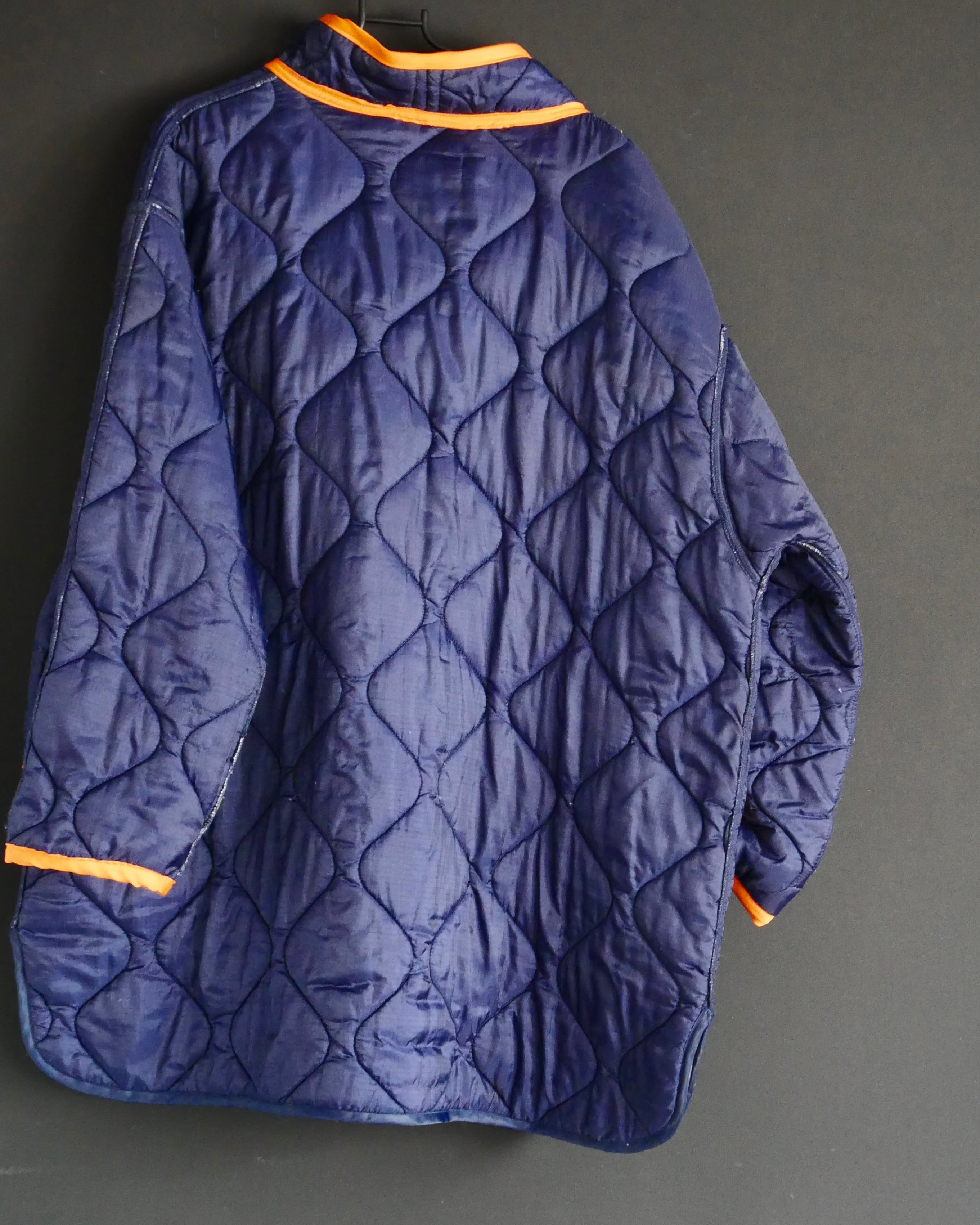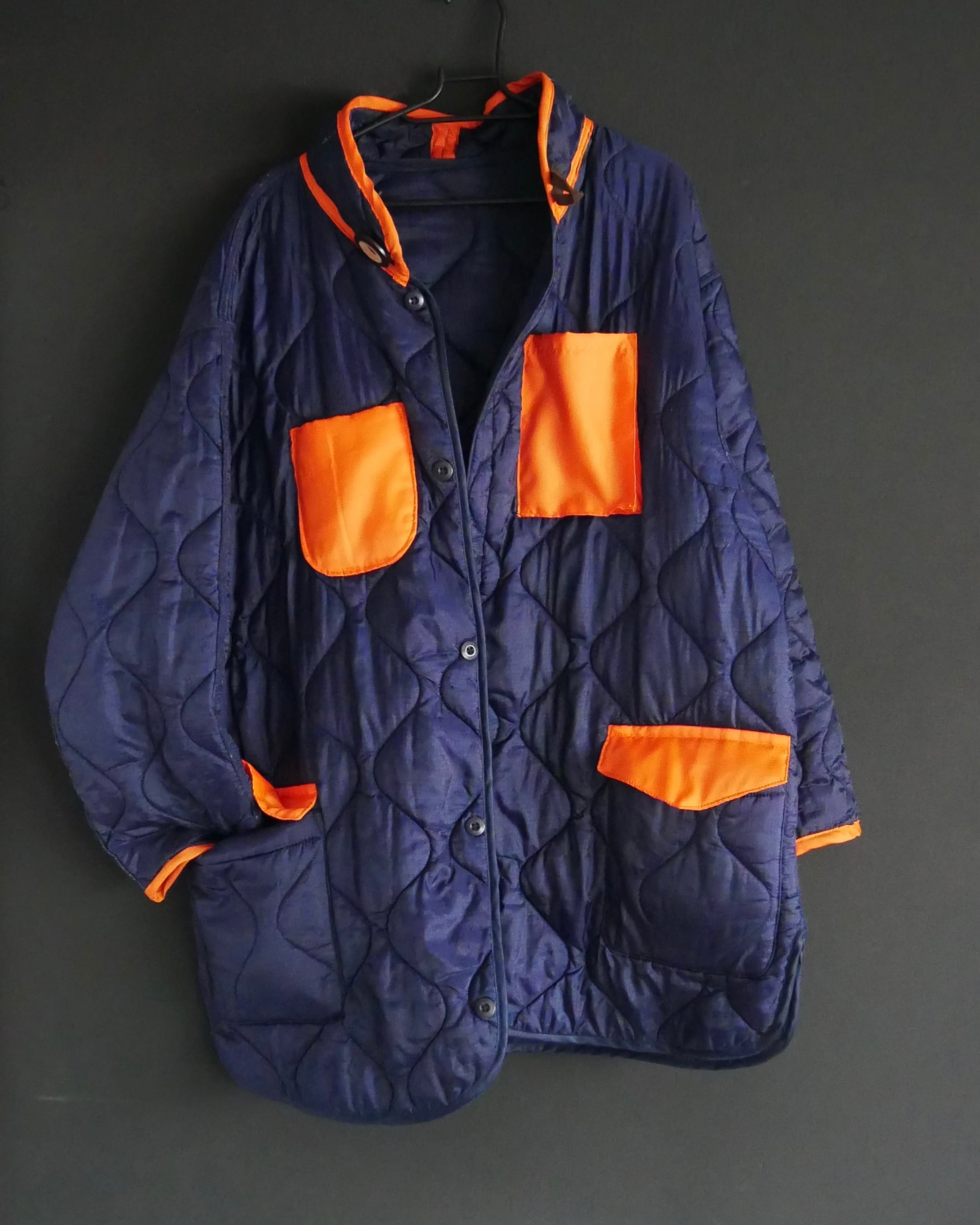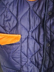 明るめネイビーのキルティングに、MA-1の裏地に使用されるオレンジ色の布を配色で使いました。