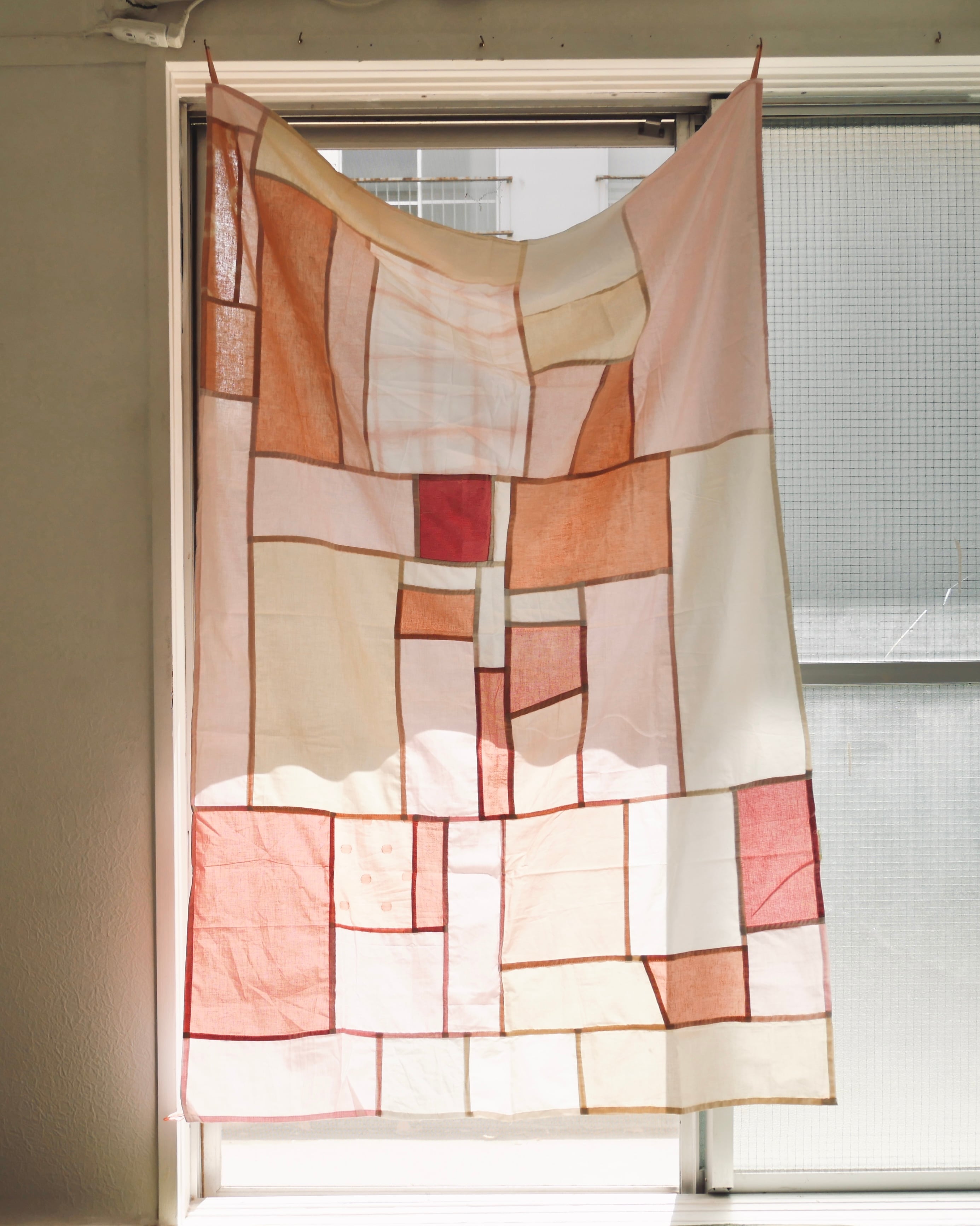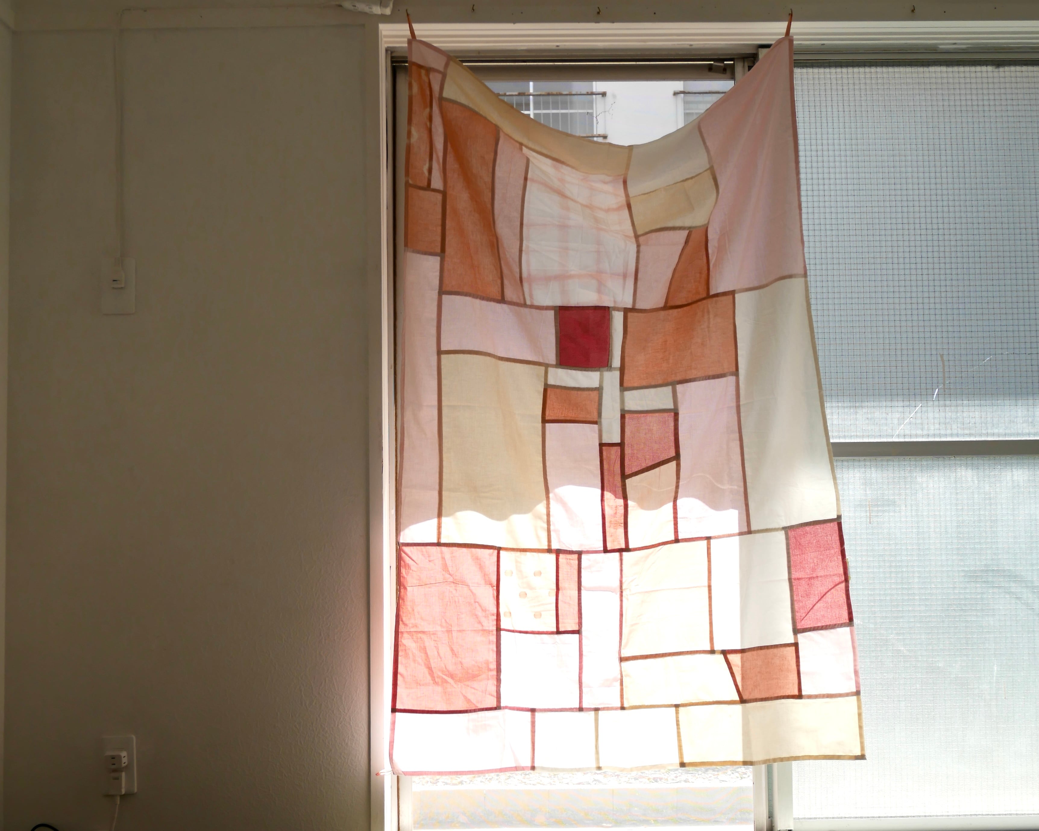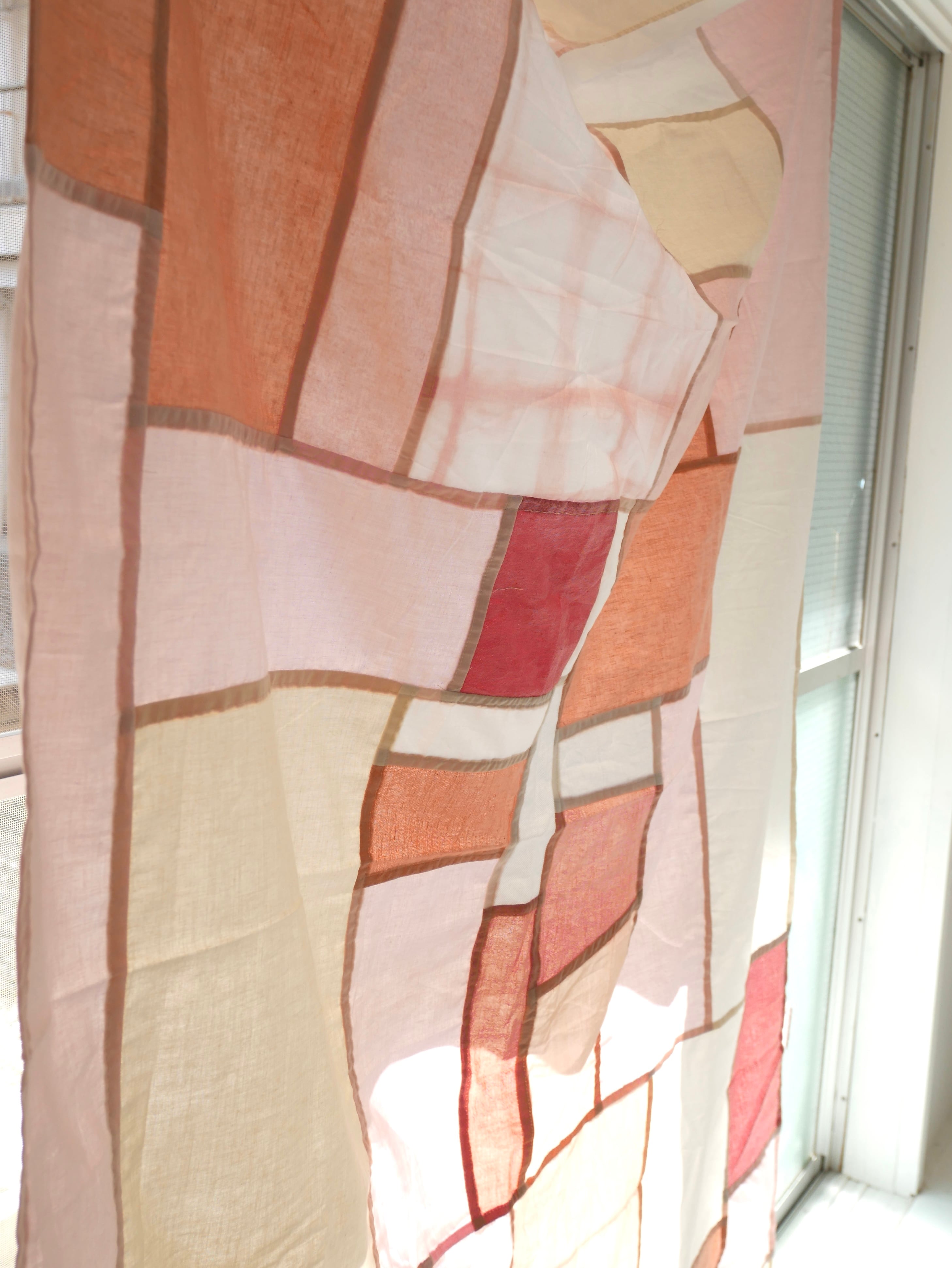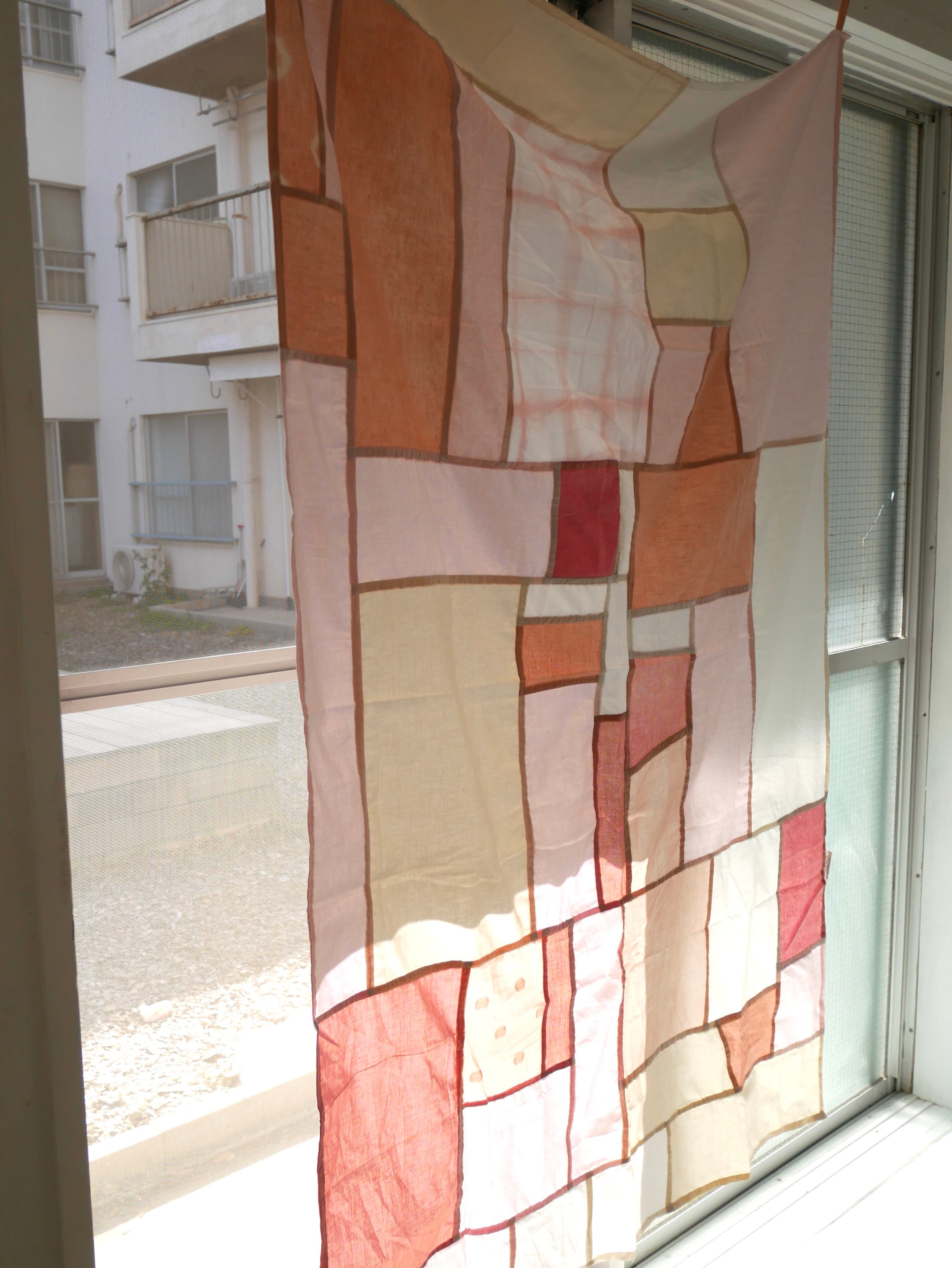 ピンクのグラデーションの全体の半分ほどが、植物染色布で、茜染すおう染めとなります。