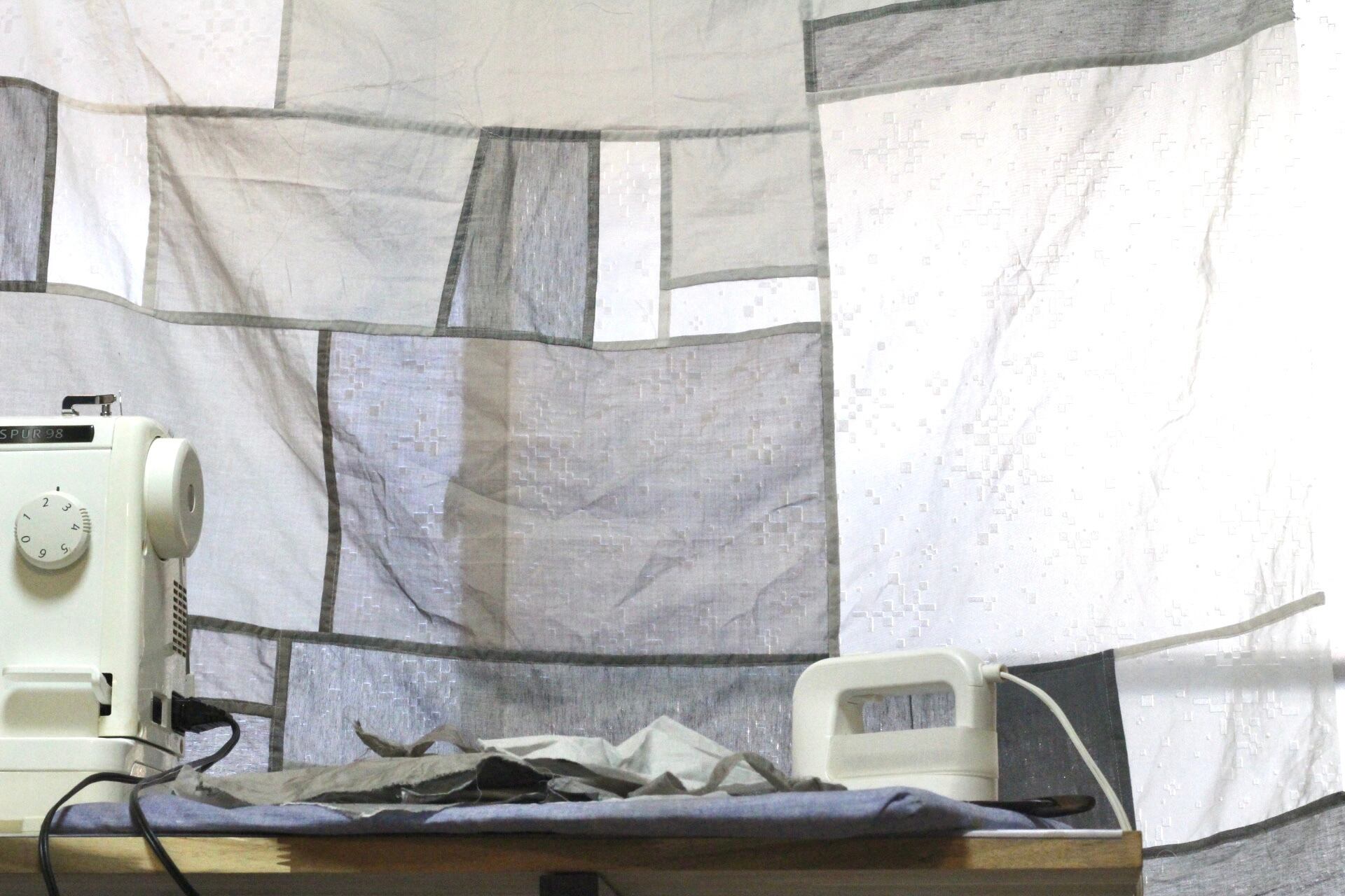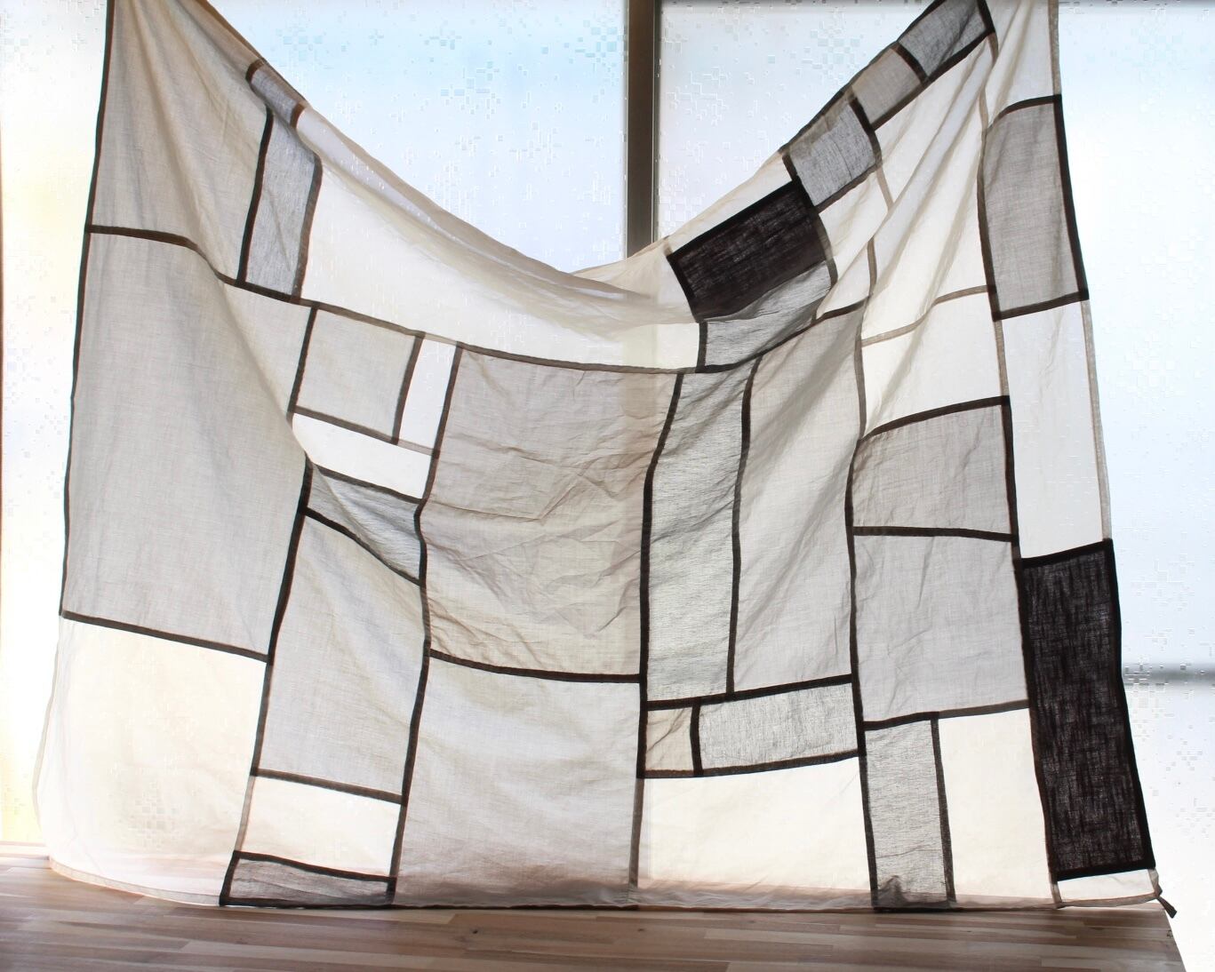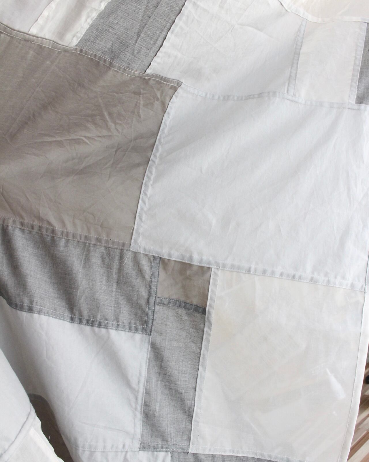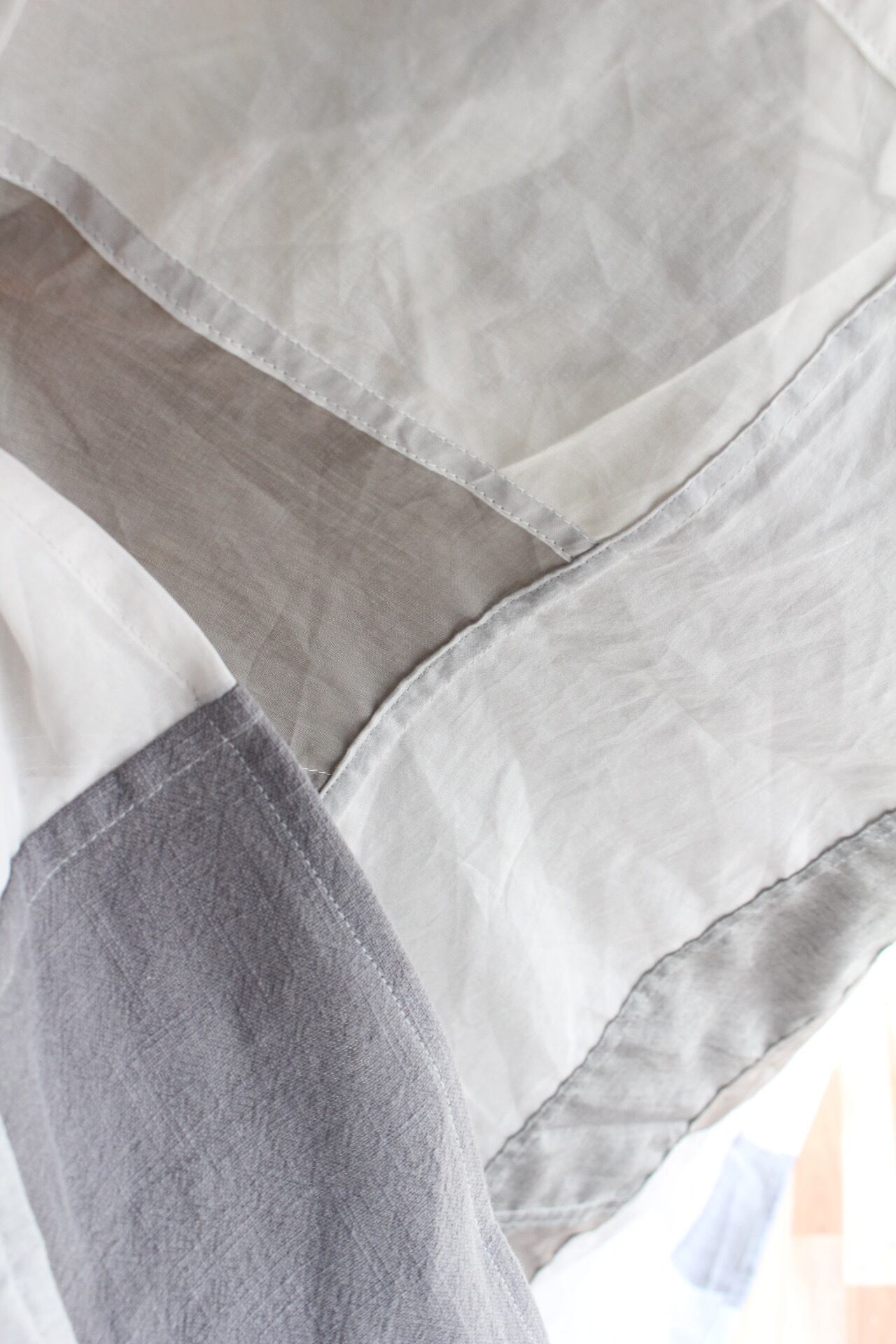 オーガンジー、薄手の綿、厚めリネンのピースを組み合わせています。