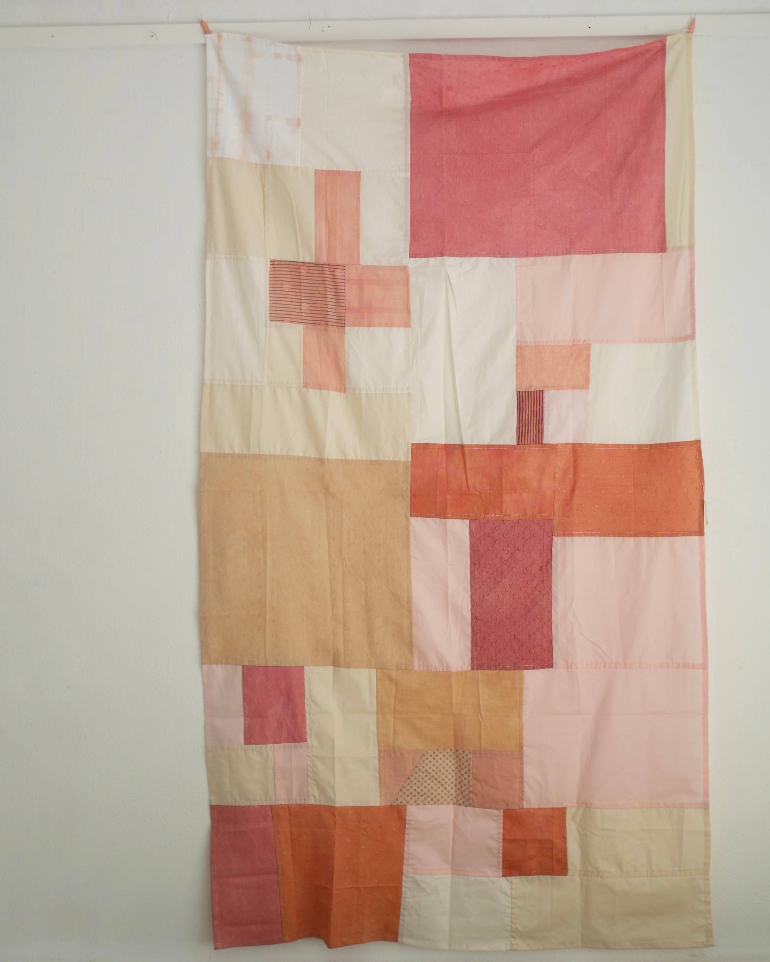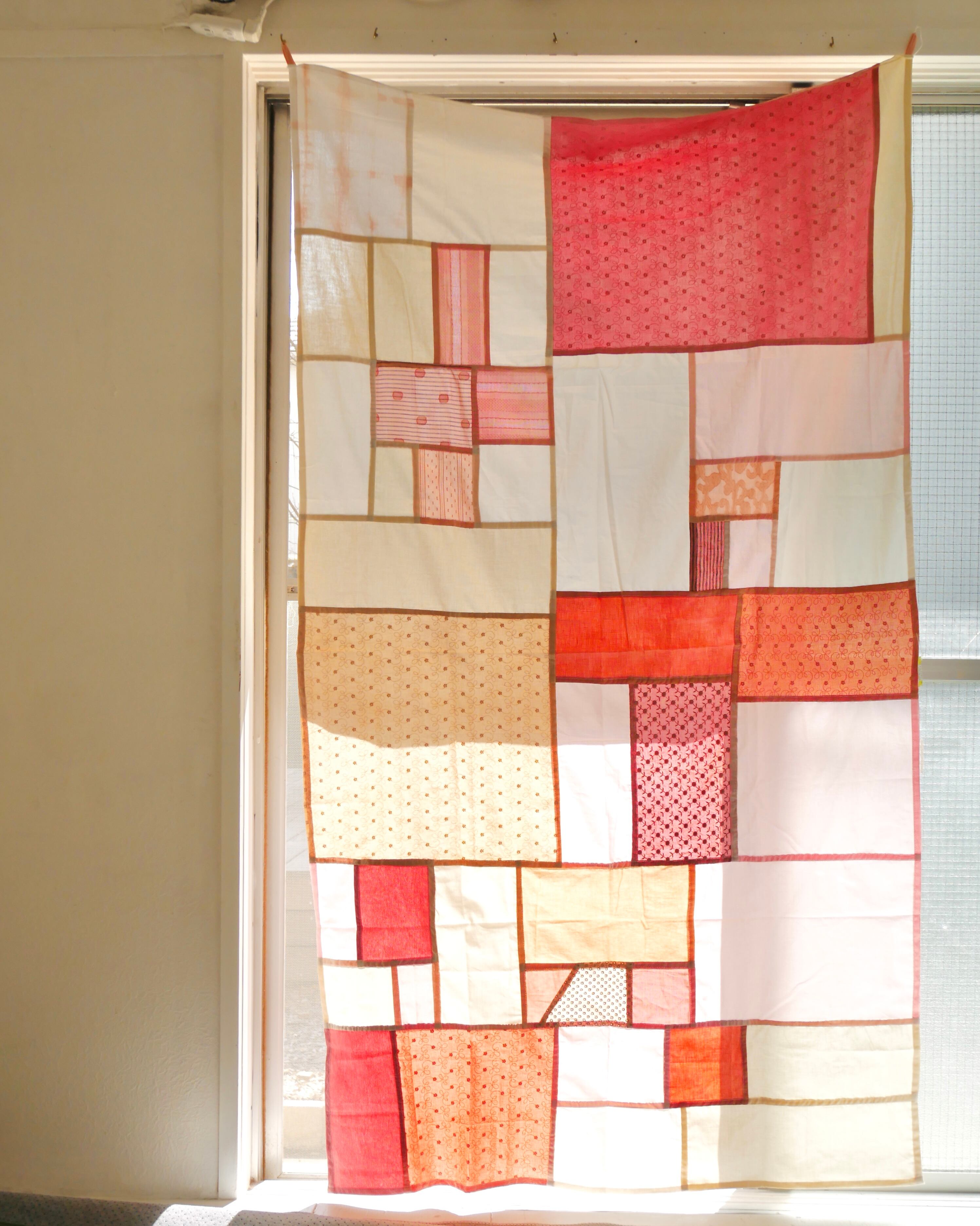 ピンクのグラデーションの全体の半分ほどが、植物染色布。茜染、すおう染め、茶葉染めとなります。