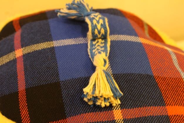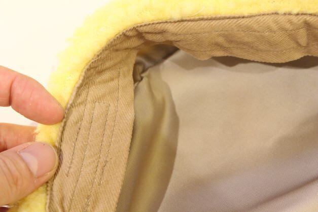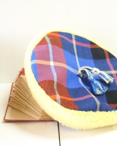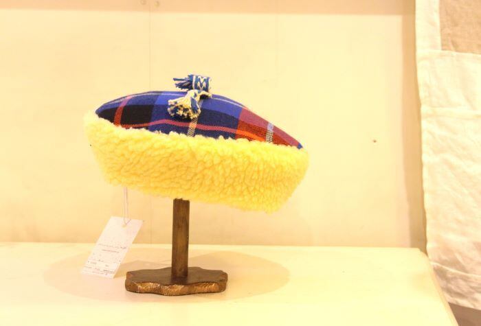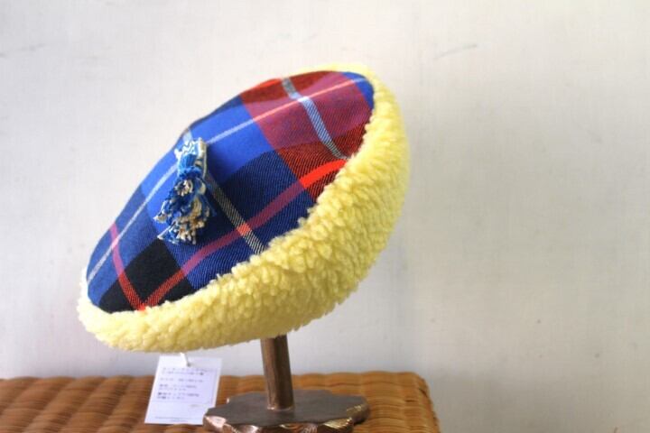 タータンチェック(青赤)×シープボア(淡い黄色)のベレー。