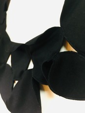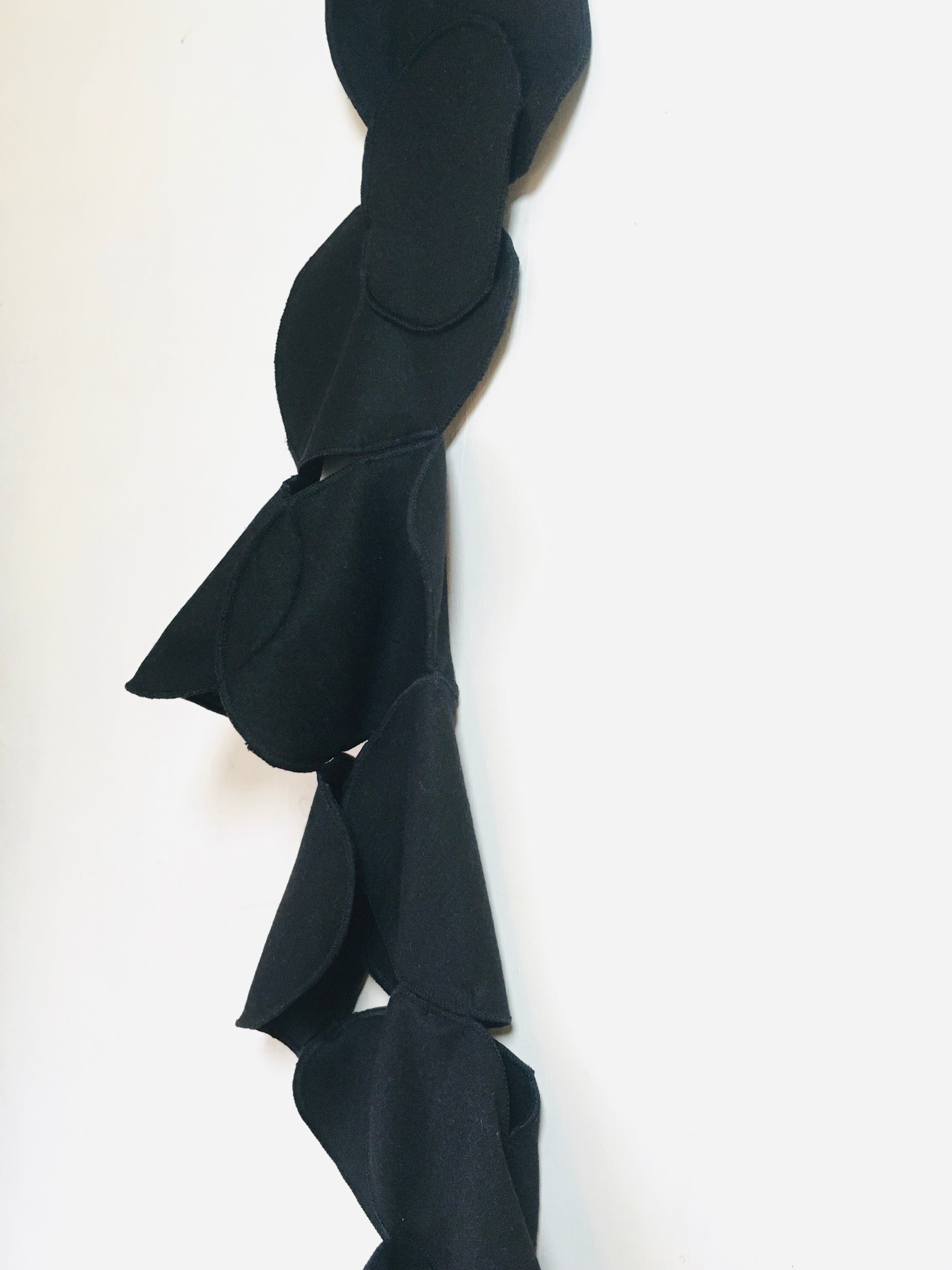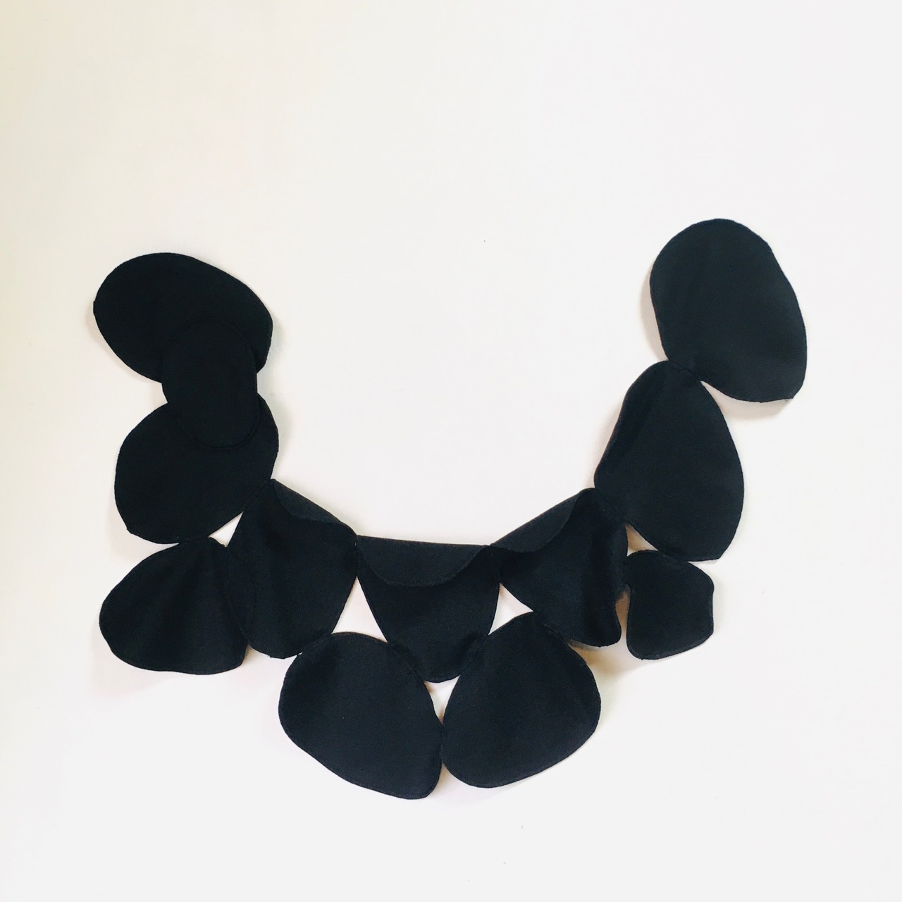 布から卵型のパーツを切り出し、縁をメローロック、のちに各パーツをつなぎ合わせた襟巻きです