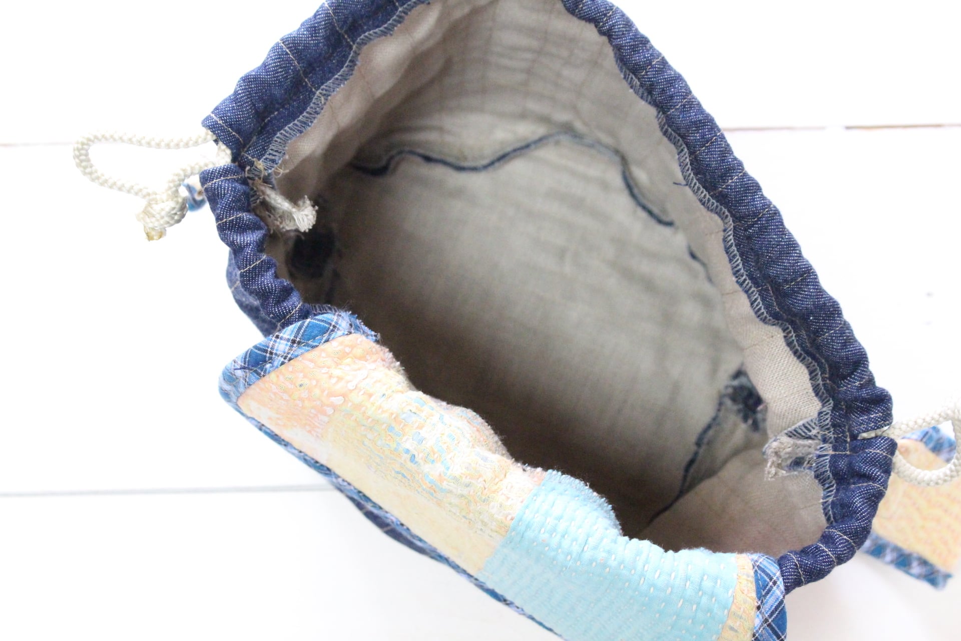 捨てずに置いてあった8ozの児島デニムのはぎれをパッチワーク、リネンを裏打ちしてステッチかけてオリジナルキルト化